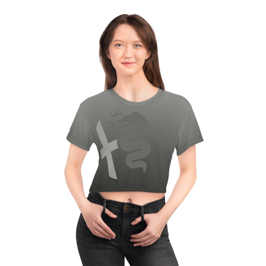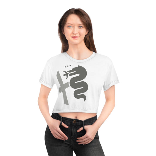 Alfa Romeo Crop Tee - Vesuvio Gray with Biscione Snake & Cross Design - Great for Going out or Pajama Top - Made in USA
