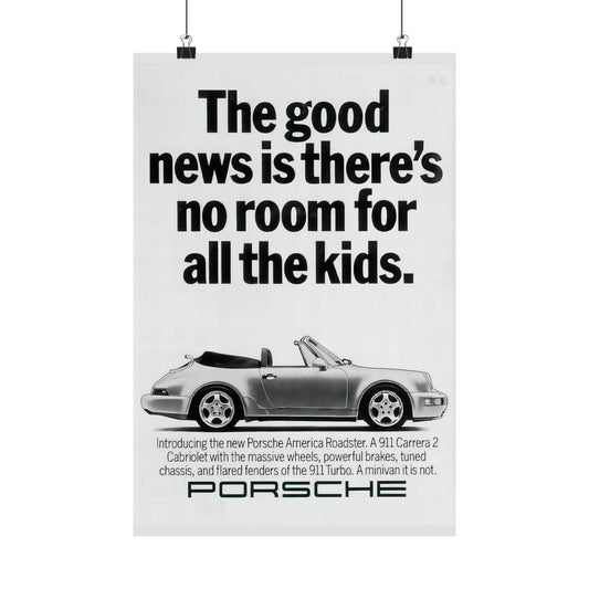 Vintage Porsche Ad Poster - Museum-Grade Matte Print - No Room for Kids - Carrera 911 2 Cabriolet - AI Enhanced from Original Advertisement