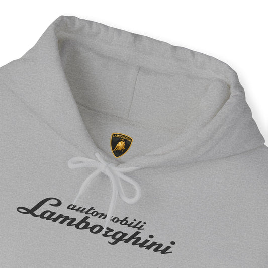 Sudadera con capucha Lamborghini - Unisex Heavy Blend™ - Logotipo de escritura negra - Ropa acogedora para entusiastas del automóvil - Detalle de escudo de toro - Manténgase abrigado en las exhibiciones de automóviles